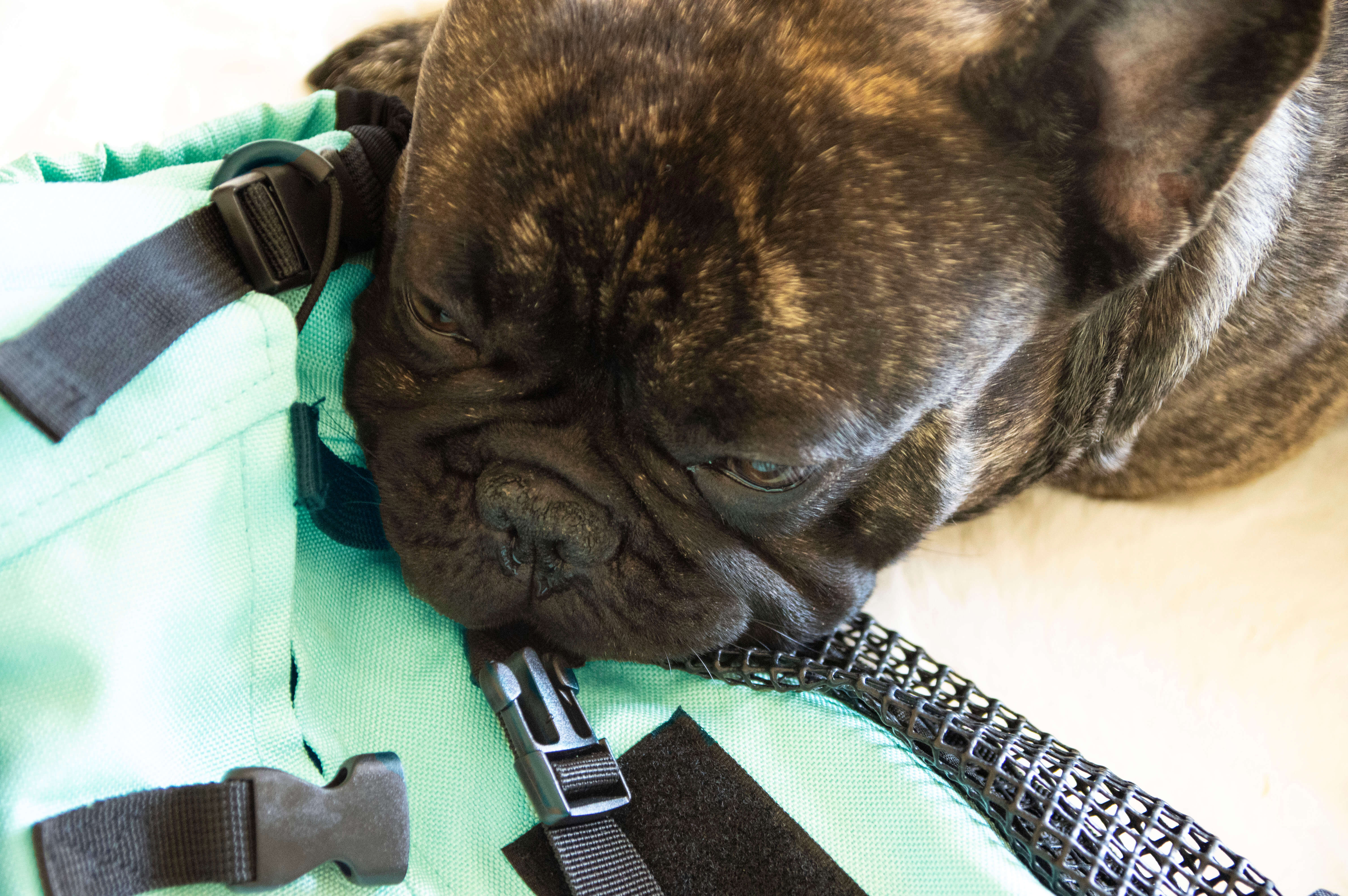 U nas Pedro z łatwością „nawiązał bliższą więź” ze swoim nowym środkiem transportu. Początkowo pozwalaliśmy na każdą możliwą interakcję (bez obsikiwania 😛 ): obwąchiwanie, zabawa odstającymi elementami, wyjadanie smaczków z wnętrza. Pierwsze włożenie młodego do plecaka nie obyło się bez stresu, nie do końca odpowiadało mu poddanie się i posadzenie szanownego doopska w plecaku. Kiedy się rozluźnił i zobaczył, że to nic strasznego a co lepsze, że za grzeczne siedzenie dostaje się smaczki, nie było już problemu 🙂